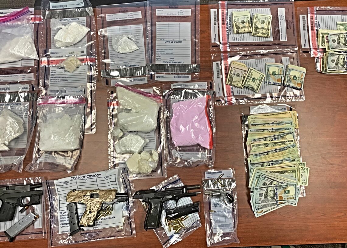 During the search, officers discovered and confiscated a substantial quantity of suspected illegal substances. The seized items included approximately 1,137 grams of suspected methamphetamine (commonly known as “ice”), 1,253 grams of suspected fentanyl, and 238 grams of suspected crack cocaine. Additionally, four firearms, $16,103 in cash, and other evidence of drug trafficking were also seized. The estimated street value of the confiscated drugs is $201,660, and the total weight of the narcotics seized amounts to around 5.8 pounds.