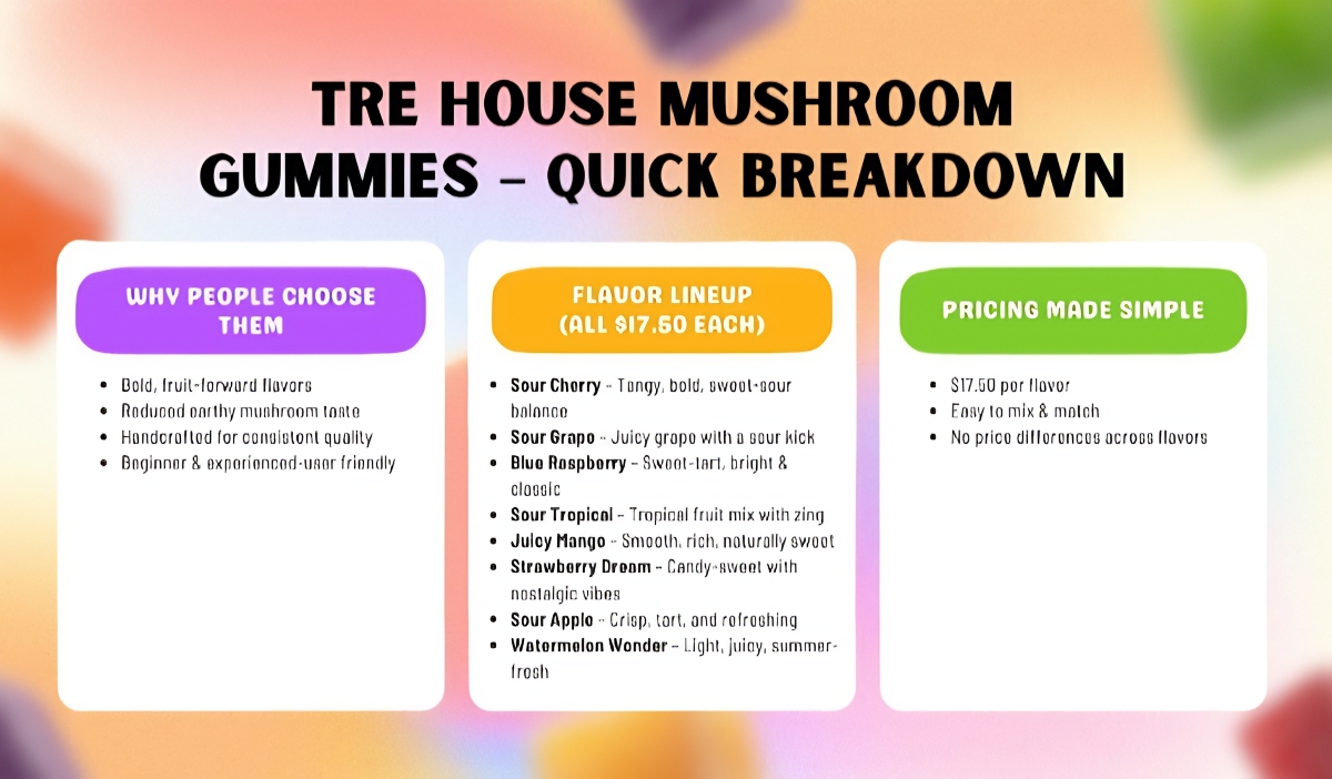 Tre House Mushroom Gummies by Mit Therapy are priced straightforwardly, removing guesswork and supporting confident purchasing decisions. Each flavor is priced at $17.50, allowing buyers to focus on their preferences rather than comparisons.